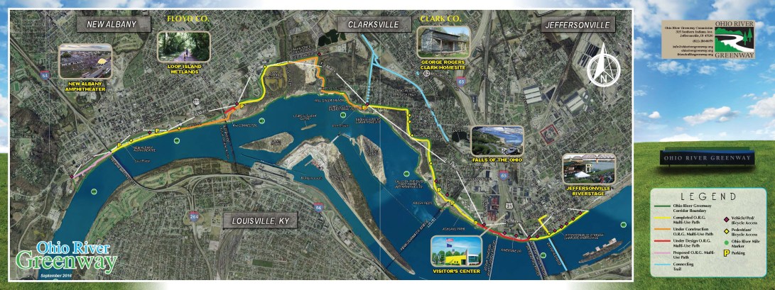 The Ohio River Greenway is one of several exemplary projects that form the basis for a complete, river-long bicycle and walker multiuse path that offers access to the whole 981 miles of the Ohio River. This portion of it, called the Ohio River Greenway, runs from the Jeffersonville Riverstage, at about river mile 602, to the downstream end of the riverside park in New Albany, at about river mile 609. The plan has been updated as Greenway 2040.